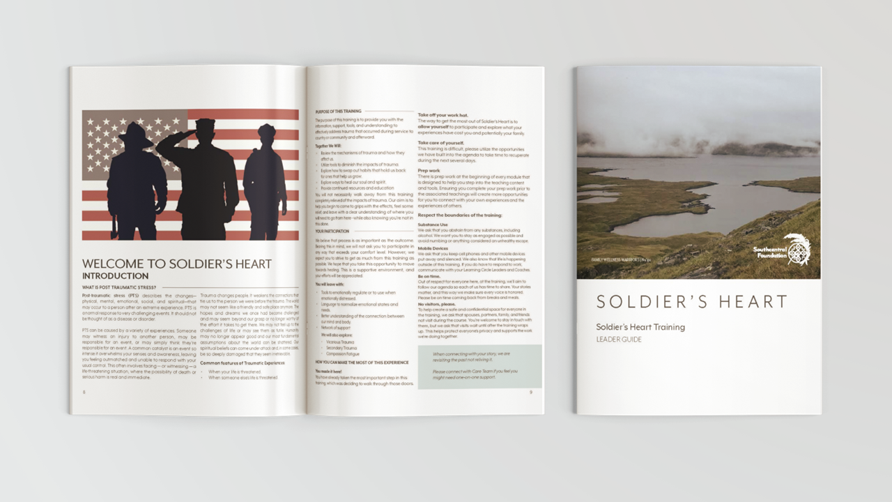 Led the redesign of Soldier’s Heart, creating a consistent suite of workbooks, facilitator guides, and training resources. Materials were optimized for clarity, accessibility, and cultural responsiveness, resulting in stronger participant engagement and streamlined delivery for trainers.